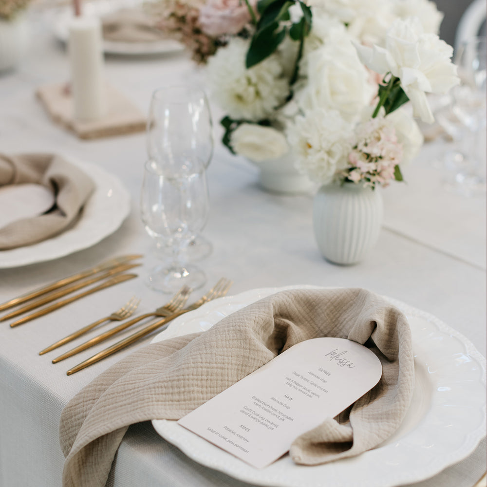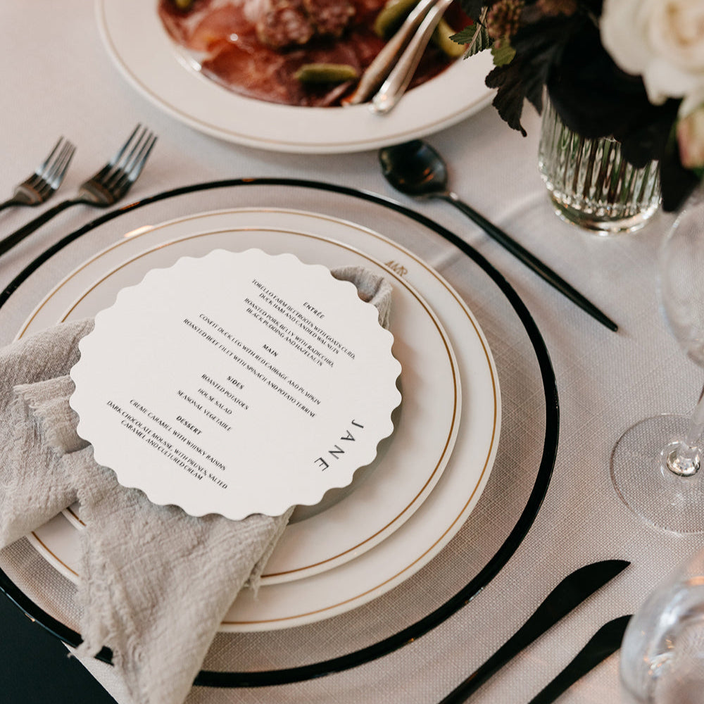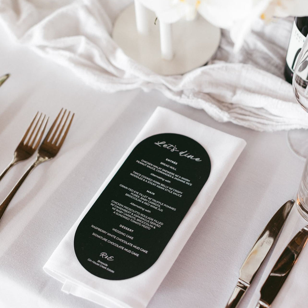 Your menus should reflect your wedding aesthetic. We offer a variety of modern and classic shapes, including arches, circles, and waved designs. Whether you're looking for boho wedding menus or a design that's clean and minimalist, we can create something uniquely you.